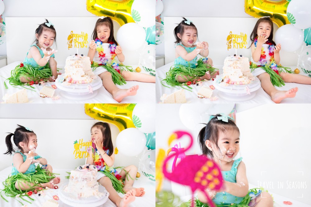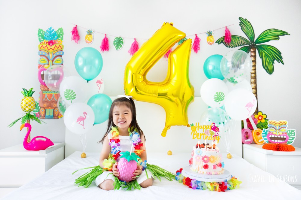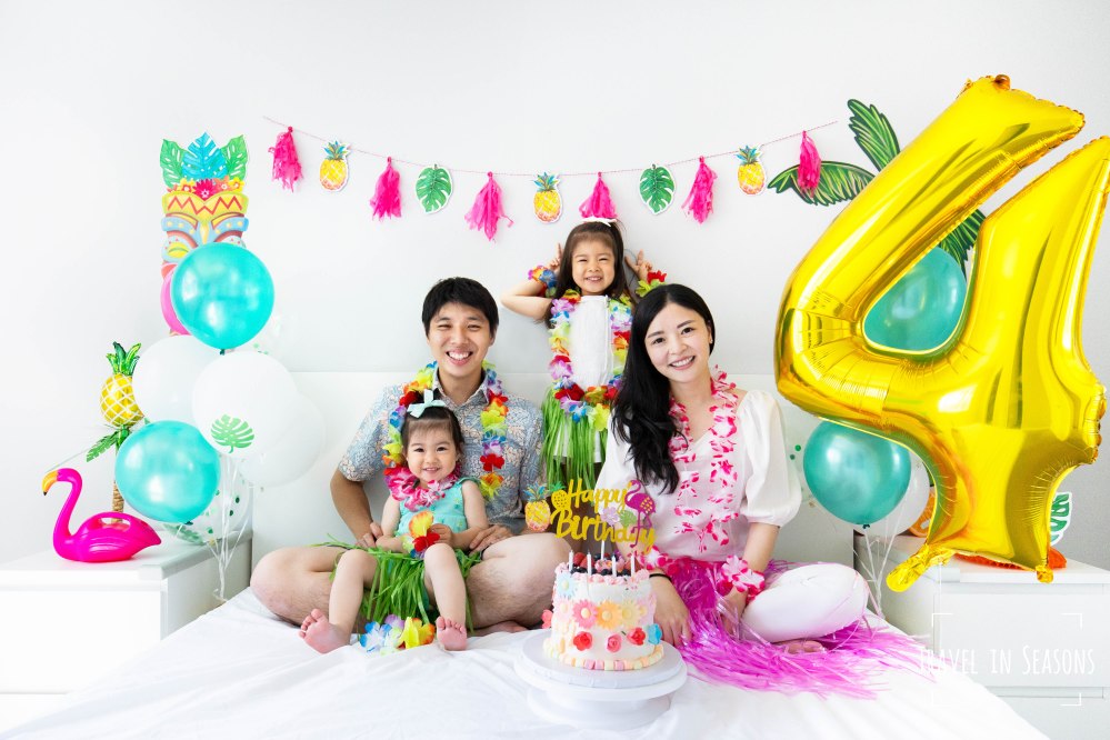 今年因為疫情的關係,我們原計畫想去海島慶生的計畫也因此打消了念頭,於是我們便將今年的生日佈置成夏威夷海島主題,讓壽星穿上花裙、戴上花圈、抱著鳳梨水壺、彈著玩具烏克麗麗和妹妹一起跳舞,感受一下渡假的氣氛。